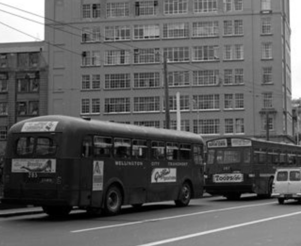 4. Digital NZ. Victoria University of Wellington. Tapuaka – Heritage and Archive Collections Black and white photograph of buses and cars on city street, with city buildings.1969c – 1970c wgtn.recollect.co.nz/nodes/view/4350